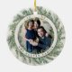 Elegant holiday photo ornament features a favourite photo on each side, framed by a wreath of lush green botanical pine foliage on a warm ivory background. Personalize with your family name and the year curved around the photo.