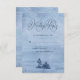 This modern watercolor wedding suite combines hand-painted mountains, lake, trees and birds with hazy light blue watercolor background with blotchy white drops resembling snowflakes and also confetti. Shades of blue: light blue, dark blue. Modern calligraphy. It is perfect for winter wedding, camping wedding, outdoor wedding.