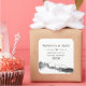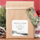 Rustic square return address sticker as a beautiful wedding mailing accessory with kraft paper background and decorative font w mountain and forest illustration on the bottom
