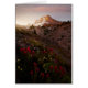 A stunning digital watercolor style image of a snow capped mountain valley sunset landscape, including crimson red poppies and bright pink and yellow flowers.