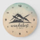 A clock with an outdoorsy minimalist style. Designed with an illustration of a mountain with sunrays emanating from behind. The word wanderlust written below. Background is a parchment color with a hint of blue.