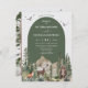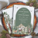 Charming and rustic watercolor woodland Wedding invitations with forest green arch. Features a mountain background with forest, fox, stag deer and bear.