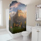 This shower curtain has a beautiful mountain scene on it.