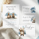 Ask guests to bring a book instead of a card and help build baby’s first library. This sweet “Books for Baby” enclosure card features a soft watercolor illustration of a little bear reading beneath peaceful mountain peaks. The layered mountains in dusty blue and muted gray tones create a calm adventure setting, while the clean white background keeps the design fresh and modern.