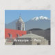 The mountains of Arequipa, Peru, viewed from a rooftop in the Plaza de Armas. In the foreground, one of the historic city's many churches is seen, with its deep red roof topped by a delicate filigreed dome and cross. Although it is summer and quite hot walking around the beautiful colonial city, the towering mountains are still snow capped.