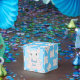 Cute mouse baby shower design, with a sweet fun cartoon that is great for a baby boy with a blue background!