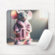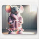 A cute, anthropomorphic mouse stands in soft lighting wearing a fluffy pink robe and matching slippers adorned with flowers