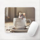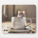 Cute mouse in a coffee cup with cracks and coffee beans.
