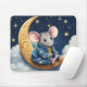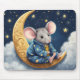 Cute mouse wearing pyjamas on a gold crescent moon with stars and clouds