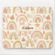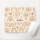 Customizable monogram name mouse pad personalized gift with a pattern of watercolor painted modern boho rainbows in earthy neutral tones.
