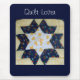 A section of a single quilt block. Text "Quilt Lover" in white script. Block: Quilted yellow, white and dark blue "Star flower" pattern. The central "star" is a white with dark yellow ducks. This is surrounded by "petals" of dark blue with red, blue and yellow flowers. Surrounding that is yellow and white gingham check.