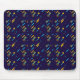 Mouse pad with a vibrant space-themed design, featuring rockets and planets against a dark blue background. A white mouse rests on the pad, suggesting usage.
