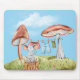 Cute grey mouse sitting on a tree stump with laundry hanging from two mushrooms