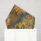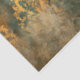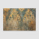 C'est un motif décoratif orné dans les tons or, turquoise et rouille. Le design présente des motifs complexes et symétriques de damas ou d'arabesques qui ressemblent à des feuilles d'acanthus stylisés, des rouleaux et des éléments floraux disposés en colonnes verticales. Les motifs ont un aspect triste, patiné avec des zones défraîchies et usées, révélant turquoise et rouille sous la couche dorée. Cet effet de patine vieilli donne au design une atmosphère antique ou vintage.