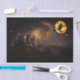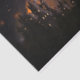 Papier cadeau d'Halloween avec image de château éffrayant, chauves-souris et une sorcière volant devant une pleine lune.