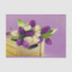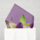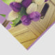 Papier de tissus avec image de tulipes violettes et blanches contre un arrière - plan lavande dans une boîte en bois.