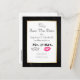 A classy wedding save the date card with pink kissy lips and a retro looking moustache illustration with the words Mr. and Mrs above. Set on a black chalkboard background and the text/words inside a white fromae with a gold gradient border. Personalize with your wedding details on front and back.
