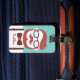 A luggage tag for the hipster gentleman. It comes with an illustration of a white gentleman silhouette with nicely combed hair, beard, moustache, geeky glasses, smart looking polka dots bowtie and suspenders. Colour palette of red and brown. Background colour can be changed. Personalize with his name.
