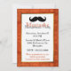 Fun Halloween party invitation with a moustache theme. Graphics of a antique looking orange background, with a gold tone edged white text area, in the middle. A cartoon style black handle bar moustache decorates the top of the invitation. Text in orange and black is ready to personalize for your party.