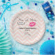 Personalized wedding paper plates with a modern style wedding design - glamourous pink kissy lips and a masculine retro-looking moustache illustration. Set on a peach chevron background. Text says Mr. and Mrs. and you can personalize with your names and wedding date.