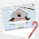 Let your friends and family know that you have a new home! These whimsical 7" x 5" holiday moving announcement cards feature two modern robins facing each other on top of their perch in front of their birdhouse that is covered in snow with snow falling in the background on a blue sky day.