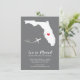 Modern moving announcement featuring the state of Florida with a red heart & airplane set on a grey background. The background colour can be changed easily by clicking personalize and then click to customize further to view our colour picker. From there you can also move the airplane & heart! Contact our shop if you require help or need another state.