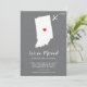 Modern moving announcement featuring the state of INDIANA with a red heart & airplane set on a grey background. The background colour can be changed easily by clicking personalize and then click to customize further to view our colour picker. From there you can also move the airplane & heart! Contact our shop if you require help or need another state.