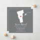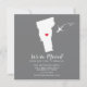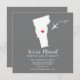 Modern moving announcement featuring the state of Vermont with a red heart & airplane set on a grey background. The background colour can be changed easily by clicking personalize and then click to customize further to view our colour picker. From there you can also move the airplane & heart! Contact our shop if you require help or need another state.