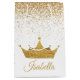 Sac moyen fait sur commande fascinant de cadeau fait dans le blanc, avec des graphiques d'une couronne et des parties scintillantes goldtone, arrosés autour du dessus. Personnalisez le nom, sur l'avant du sac, pour lire ce que vous voulez. Grand sac de cadeau approprié à toute princesse d'âge.