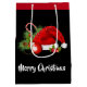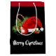 Ce sac cadeau de Noël est montré en noir avec une garniture rouge et un imprimé d'art festif de chapeau de Noël. Customisez cet objet ou achetez tel quel.