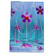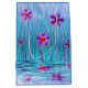 Dessin numérique de jolies fleurs violettes stylisées aux centres rouges brillants. Ils vous regardent tranquillement depuis la haute herbe à côté d'une piscine d'eau claire qui ondule.