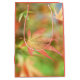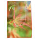 Sur fond de feuilles vertes d'été d'un érable japonais virant au rouge et au jaune automnal, une feuille de squelette rose et or dérive lentement vers le sol.