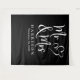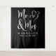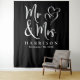 Modern custom black photo backdrop tapestry for your wedding reception or other wedding events with "Mr & Mrs" written in a large elegant white script and an illustration of two hearts joined together. Add your married name and wedding date.