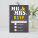 Mr. and Mrs. Modern typography black, yellow chalkboard wedding RSVP response or reply card featuring the Mr. and Mrs. courtesy titles in white, the ampersand in yellow and the period in white with a gold heart in it. This modern elegant and contemporary, elegant wedding template design with has a vintage rustic flair to it. It is fun and trendy and is part of a wedding collection or set fully customizable perfect for a winter wedding.
