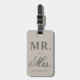 A modern, fun luggage tag featuring large Mr. and Mrs. text and family name below in a mix of gender specific fonts. Perfect for newly weds and honeymooners.