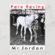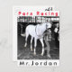 Mr. Jordan, a 4 year old roan or white solid thoroughbred by Kantharos being walked in the paddock by his groom before the inaugural running of the Frosted stakes at Parx Racing. Wearing a black shadow roll Mr. Jordan stops to pose for his photo to be taken. Photo is in black and white of this gorgeous racehorse.
