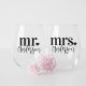 Celebrate love with this cute personalized wine glass set featuring "Mr" and "Mrs" with a small heart, and the couple's surname beneath in black hand lettered script typography. Customize with their name for a sweet wedding or housewarming gift for the newlyweds.