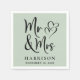 Elegant custom sage green napkins for your wedding reception or other wedding events with "Mr & Mrs" written in a large script and an illustration of two hearts joined together. Add your name and wedding date.
