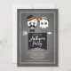 Vintage gothic halloween party invitation featuring Mr. & Mrs. skulls with a banner sign with a hand lettered calligraphy font set on a grey background.