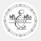 This round shape sticker is shown with a custom name Mr. & Mrs. print, personalize and change the name and year to yours with this template.