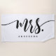 Mrs Black And White Newlywed Bride Personalized Beach Towel. Modern script personalized name beach towel. Perfect honeymoon towel for the bride. Personalize this custom design with your own name or text.