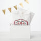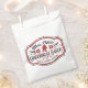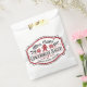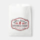 This farmhouse style favour bag features a logo style design that says "Mrs Claus' Gingerbread Bakery." You can personalize with a name. Colours include red and black.