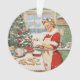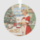 In a cozy, snow-covered kitchen, Mrs. Claus is captured in the midst of holiday baking. Dressed in a festive red dress with fur-trimmed sleeves, and a matching apron, she smiles warmly as she prepares a fresh batch of cookies. The scene is filled with Christmas cheer, complete with a beautifully decorated tree adorned with candy canes and red ornaments, while snow gently falls outside the window, adding to the magical atmosphere of the season.