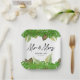 A simple minimalist tropical leaves and black script text "Mr & Mrs" wedding paper plates that can be customized to your surname and wedding date. Ideal wedding decor to a tropical themed wedding.