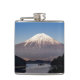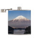 Majestic Mt Fuji reflected in Lake Tanuki and framed by the river banks at nightfall.