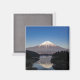 Majestic Mt Fuji reflected in Lake Tanuki and framed by the river banks at nightfall.
