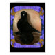 A black Muffed Tumbler pigeon is framed by flowers. This is a vintage oil painting from the late 1970s.