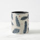 A coffee mug featuring a denim blue and red fern design