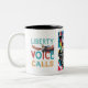 The "Liberty's Voice Calls" mug design features a compelling and inspirational illustration. The mug showcases a striking image of the Liberty Bell, with its iconic crack and detailed texture, set against a backdrop of dynamic, swirling waves of colour that symbolize the powerful resonance of freedom. The phrase "Liberty's Voice Calls" is elegantly wrapped around the bell in a classic, vintage-style font. The design uses a rich colour scheme of deep blue, bold red, and crisp white, reflecting a sense of patriotism and pride. This mug is perfect for enjoying your favourite beverage while celebrating the enduring spirit of liberty.