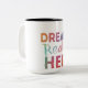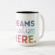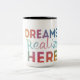 A stylish mug with "dreams realize here" in vaberient and in multicolour